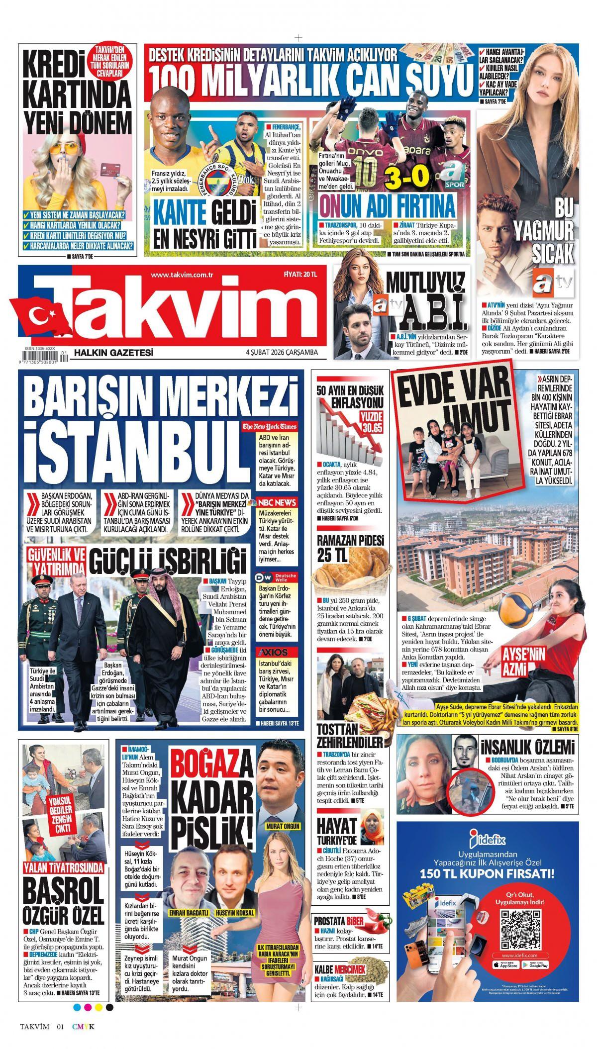 Takvim Gazetesi 5 Şubat 2026 Günü Gazete Manşetleri