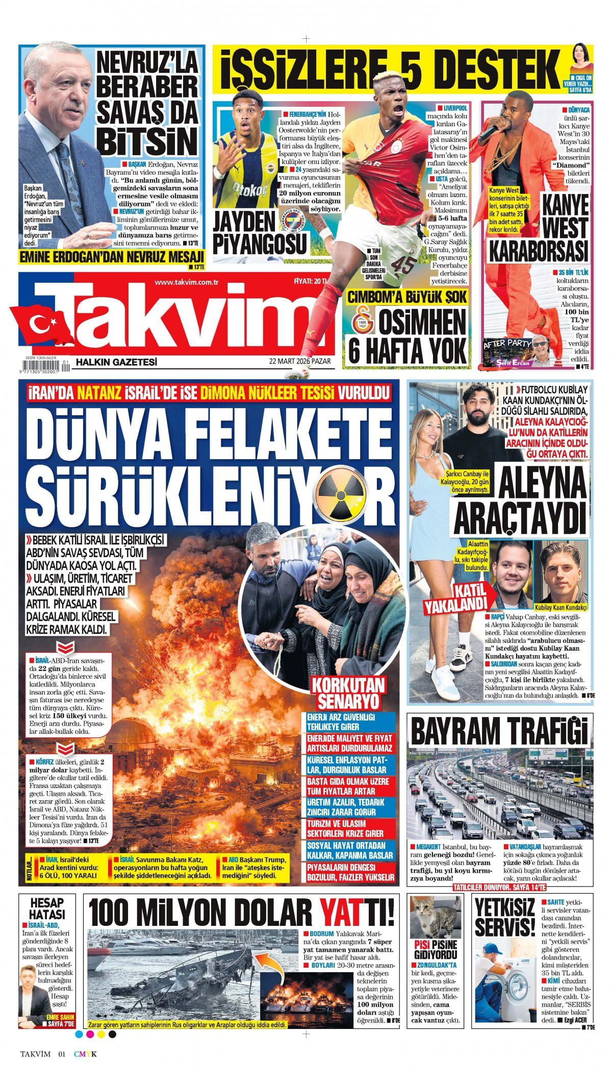 Takvim Gazetesi 23 Mart 2026 Günü Gazete Manşetleri